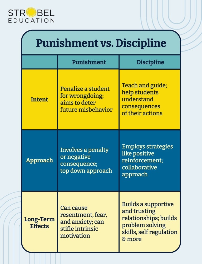 By examining the intent, approach, and long-term effects of each method, we aim to shed light on how they impact student behavior and learning. Whether you’re a seasoned educator or new to the classroom, this exploration will arm you with the knowledge to foster a positive school climate that promotes student-centered learning. Join us as we navigate through examples, strategies, and the philosophy behind choosing discipline over punishment, aligning with Strobel Education’s mission to enhance teacher well-being and student success.
